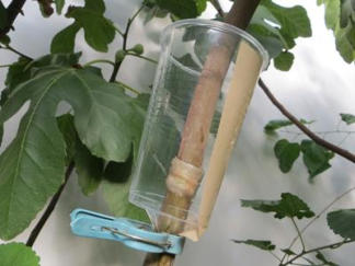 Den Becher am Stängel soweit hoch schieben, dass die Clonex Stelle noch im Becher aber fast am Boden ist. Dann die Pflanzen